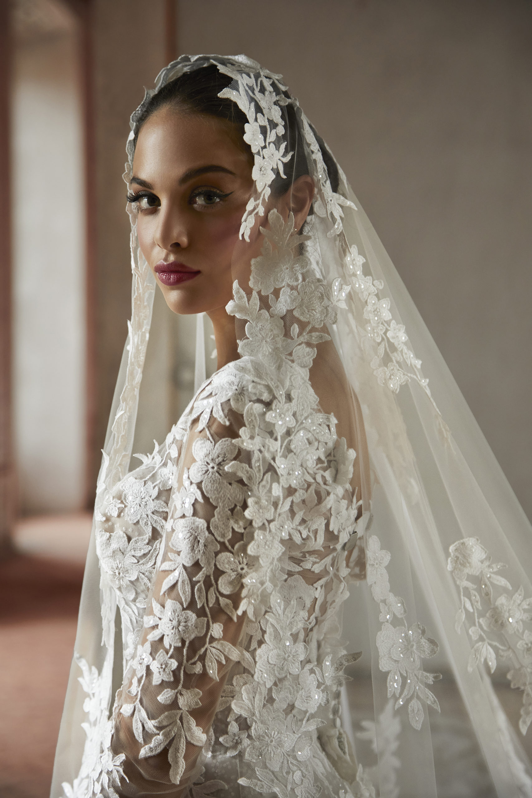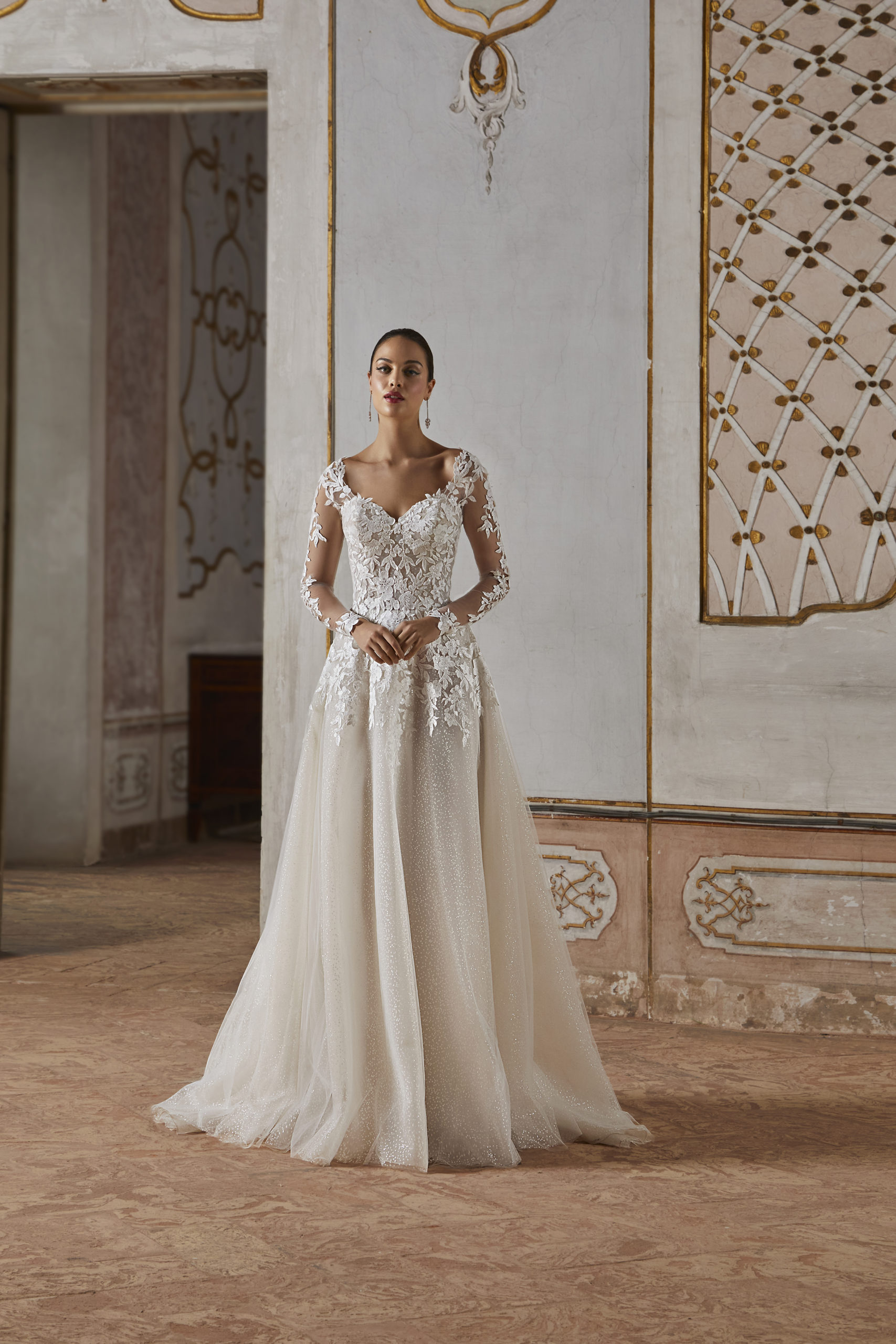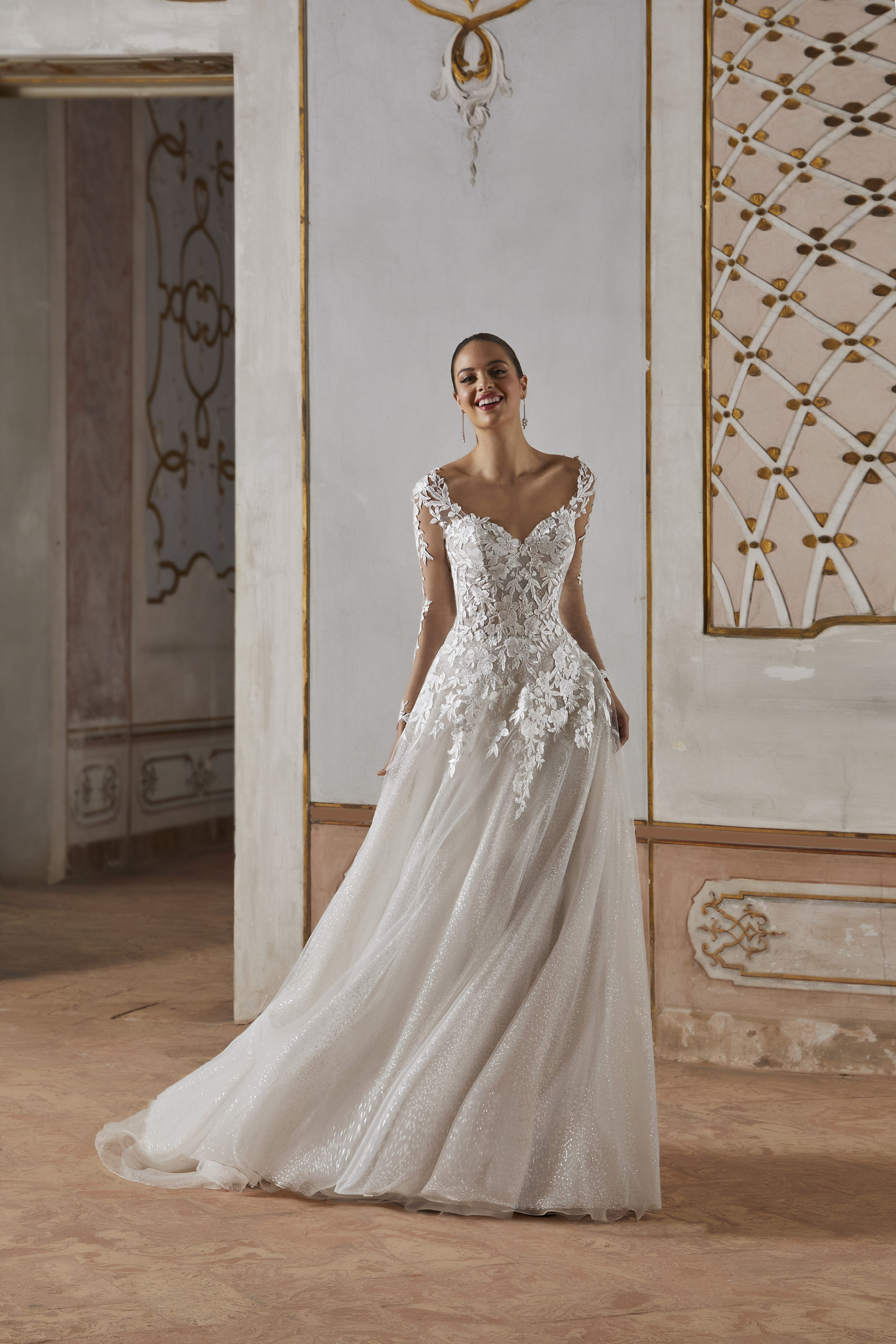 La robe de mariée Cosmobella 8215 incarne l’élégance classique avec une touche de modernité. Son corsage ajusté, orné d’une somptueuse dentelle florale, se fond harmonieusement dans des manches longues transparentes pour un effet romantique et raffiné. Le décolleté en cœur et le dos plongeant ajoutent une sensualité maîtrisée, tandis que la jupe fluide en tulle scintillant illumine chaque mouvement. Un voile assorti en dentelle complète parfaitement cette silhouette de rêve.