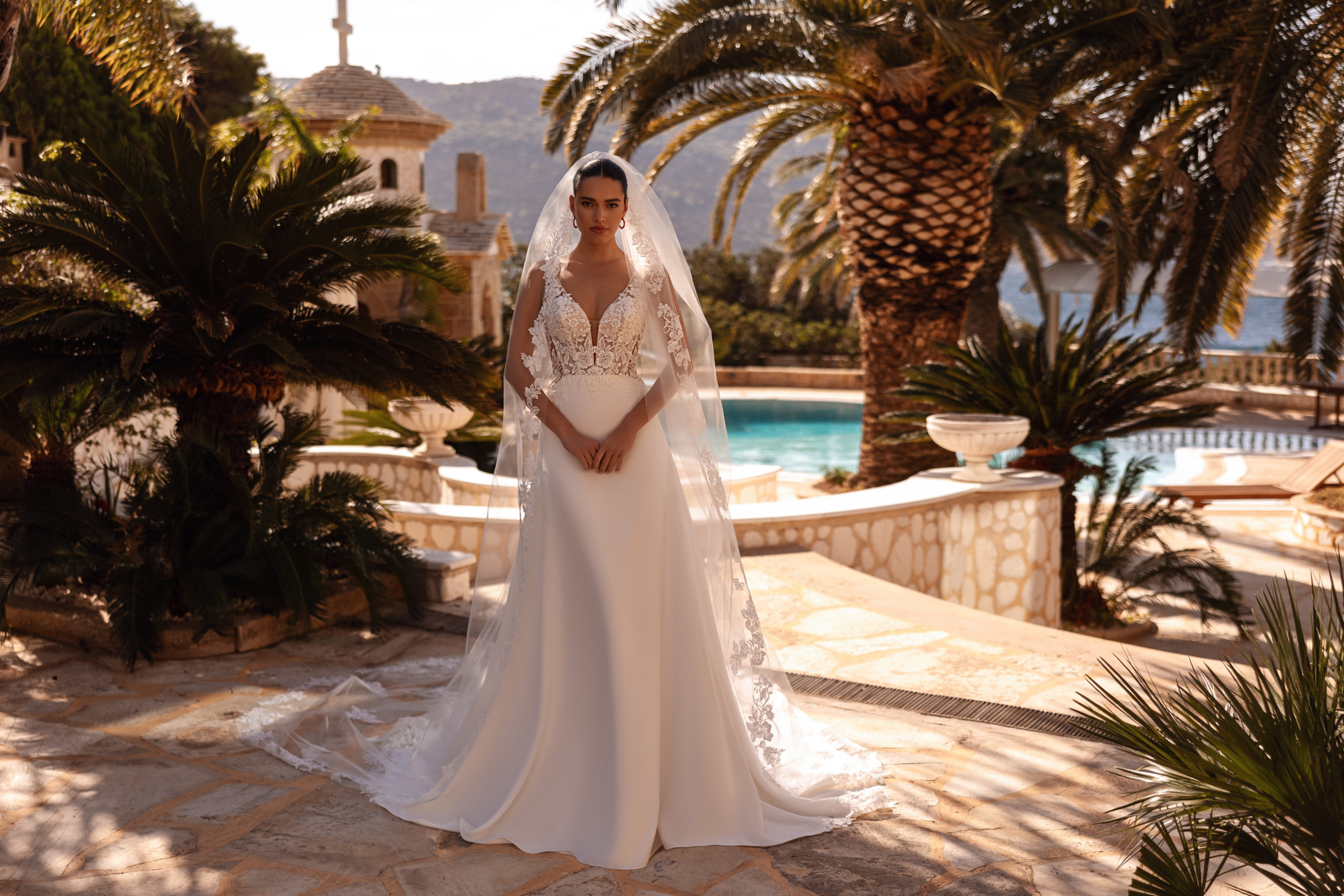 La robe de mariée Cosmobella 8258 incarne l’élégance naturelle et la modernité. Son corsage transparent, finement brodé de dentelle florale, met en valeur le buste avec un décolleté plongeant et de fines bretelles. La jupe fluide en crêpe s’ouvre avec légèreté pour une silhouette allongée et gracieuse. Sa traîne bordée de dentelle ajoute une touche romantique et raffinée, tandis que le voile assorti sublime l’ensemble.